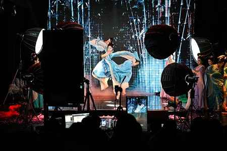 陕西省歌舞剧院的舞蹈演员在直播间进行团播表演。记者 邹竞一 摄