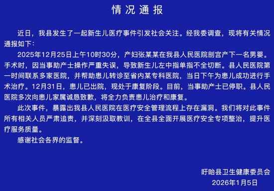 通报称,2025年12月25日上午10时30分,产妇张某某在该县人民医院剖宫产下一名男婴。手术时,因当事助产士操作严重失误,导致新生儿左中指单指不全切断。县人民医院第一时间联系多家医院,并帮助患儿转诊至省内某专科医院,当日下午为患儿成功进行手术治疗。12月31日,患儿已出院,现处于康复阶段。目前,当事助产士已停职。县人民医院多次向患儿家属诚恳致歉,将全力负责患儿治疗和康复。
