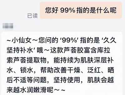 那为何标称“99”?该店铺客服解释称:“99”指的是“久久坚持补水”,与产品成分含量毫无关系。