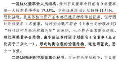 对于姜伟的这个说法,贵州证监局称,“这个通知是鼓励和倡导性的,最终还是要看双方的意愿。未发现华创证券主动攫取实际控制权,目前贵州百灵的实控人还是姜伟。”