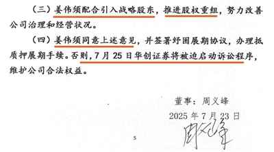 一份落款时间为2025年7月23日,签有“周义峰”字样的文件出现在贵州百灵董事会上,文件显示由华创证券纾困计划提名4董事和董秘人选。同时还提出,“姜伟须配合引入战略股东。并表示如果不同意将于7月25日华创证券被迫启动诉讼程序。”