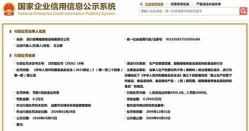 国家企业信用信息公示系统显示,今年2月,四川省蜀福香食品有限责任公司,因生产经营超范围、超限量使用食品添加剂的食品的行为,被成都市邛崃市市场监督管理局没收违法所得2950.2元,并罚款2000元。主要违法事实显示,该公司生产的原切风干肉(麻辣味)检出诱惑红成分,涉嫌违反食品安全法。