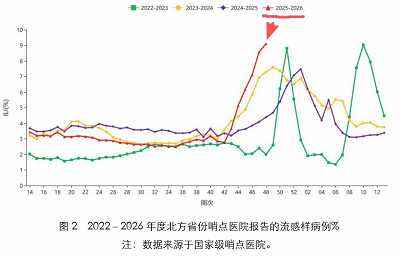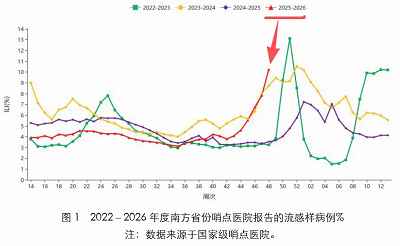 从图上可以看到,不论是代表南方省份的图1还是代表北方省份的图2,在整个监测季节的第48周(也就是大概每年11月最后一周),红色数据已经超越黄绿紫。