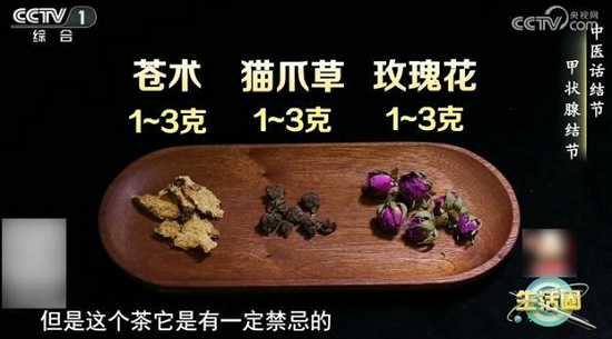 苍术、猫爪草、玫瑰花,各取1~3克,用热水冲泡饮用,具有祛痰湿、疏肝解郁、散结的功效,适合甲状腺结节人群饮用,也可以用于预防甲状腺结节发生。