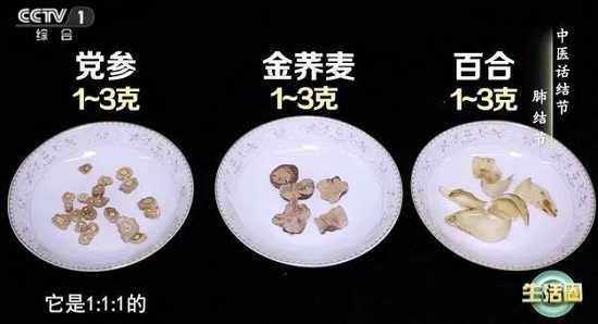 百合、党参、金荞麦,各取1~3克,用热水冲泡饮用,能够舒缓不良情绪、补肺气、散结,适合肺结节人群饮用,也可以用于预防肺结节发生。