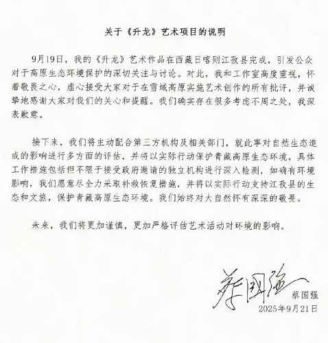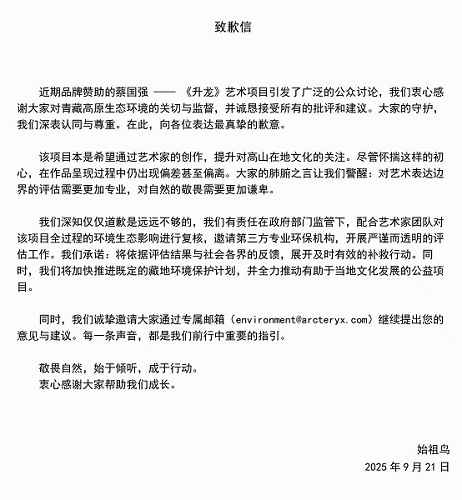 中新网北京9月21日电(记者 张曦)在网友持续不断的质疑与批评声中,9月21日,高端户外品牌始祖鸟与国际知名艺术家蔡国强终于就其于喜马拉雅山脉燃放的烟花作品《升龙》公开道歉。同日,日喀则市委、市政府宣布成立调查组赶赴现场核查,并表示将依法依规处理后续事宜。