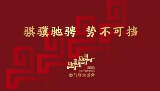 中央广播电视总台12月10日发布2026年春节联欢晚会主题和主标识——主题为“骐骥驰骋 势不可挡”;主标识从“骐骥驰骋”中提炼“四马齐驱”的创意灵感,融合中国传统云纹、雷纹、回纹的经典元素,勾勒出四匹骏马齐头并进、拾级而上的视觉意象,既彰显传统美学韵味,又传递出奔腾奋进的时代气息。