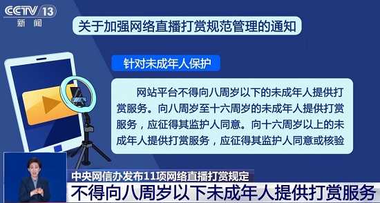 据记者了解,“通知”中提出11项具体要求,包括:明示打赏规则、规范打赏营利权限开通、完善未成年人保护机制、建立打赏营利行为负面清单、加大处置和曝光力度等。