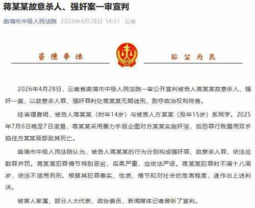 中新网4月28日电 据云南省曲靖市中级人民法院官方微信消息,4月28日,云南省曲靖市中级人民法院一审公开宣判被告人蒋某某故意杀人、强奸一案,以故意杀人罪、强奸罪判处蒋某某无期徒刑,剥夺政治权利终身。